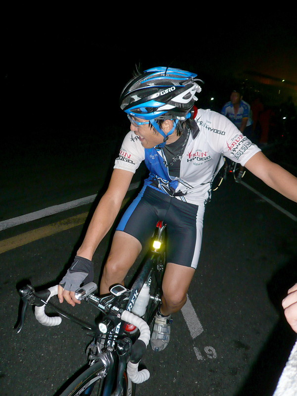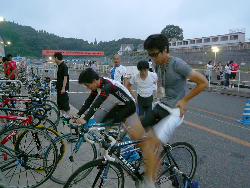 手前真剣にUPするワタクシ。奥どういう心持かよくわからない鳥監督 トライアングラー/坂本真綾をひたすら聞いてたのは秘密。。 感想(昨日のエントリとかぶるかも) スタートももうちょっとどないかならんか? 先導バイク抜かそうとする阿呆はほっといてローリングスタートなんやけど のろのろスタートから急激に上げるよりもう少し長めにローリング区間をとって 徐々に上げる方がええと思う。一気に開放するもんやから スタートダッシュ決めようと全力で行ってまっすぐ走ってくれない人が・・・ 先導のバイクもね。自分は別になんとも思いませんでしたが バイクに向かって罵声を浴びせる人には正直タマゲタ。 バイクなんてあのスピード域なら自転車なんかより断然挙動も安定してるし 予想が十分に可能な事やのにそんなにいらついて声を荒げる事もないでしょ。 そんなものも予測してバイクコントロール出来ないんだったら もう少し位置を下げるなり上げるなりして安全に走行出来る所で走行しましょう。 しつこいけどバイクが邪魔と思う程度のスキルなら 無理して先頭集団に取り付いている人の方がよっぽど怖いと思うんですが。 後自分も危なかったね(苦笑) 基本的な前提として私は目が悪いのです。 更に夜なんでコース見えてないです。幾ら何回も走ったコースとはいえ コーナーなんかはRの感覚がわからなくてつい減速。 コーナーに関してはなるべく後ろにつかれない外に出る事を心がけましたが もしかするとこんな所で減速すなと思われてたかも知れません。 一度ライン上に既に自転車がいてインかアウトか迷っている内に どうにもならなくなって大きくラインをはずしてはずした更に先にも自転車がいて正直あせった。 更にアウトに膨らんで避けたけどアウトもアウト一杯一杯でクリア。集中力不足だね。 反省・・・度付サングラスの導入本格検討してますのでしばらくお待ちを・・・ 毎度の事だけどピットは安全速度でね。焦るのはわかるけど子供もいるし危ないよ。 自分みたいにピットアウト時「よれる」「斜行する」人間もいるから要注意。 ソロで走ってる人間はフラフラなんです。。 ゼッケンは「横」ではなく「後ろ」につけて欲しいんじゃよ。 走ってて誰が誰かわからんじゃまいか。 見難いからソロかチームかよくわからん。下手すると腕で隠れて4時間か10時間かもわからん・・・ あのコースはフラットやからさして練習してなくても体重があってスピードかある人 だったら数周ぐらいはかなりのスピードで走れてしまう。 確かに先頭に近い集団につけるかもしれないけど走行技術?マナー?が 自分の目から見ても目に余る。スピードが出てるから余計に怖い。 多分実業団のレースを走る人から見ると自分らが恐怖を与えるのと一緒かな。 その点も自戒を込めて反省。 集団もまた有り得んぐらい速かった・・・ 3時間過ぎて公式では39.3kmぐらいだったような。 同コースで昼間に開催される天満屋ハピータウンカップと比較しても速い。 天満屋の3時間ソロなんて実業団選手が多く参加した去年こそAVE40kmでゴールしてるけど それ以前では3時間優勝タイムより速い事も・・・それ+1時間走るんだからキツイわ・・・ 今回の周回数はレースレコードだそうです。 自分もトップと同一周回なんでレコード更新の一員になってウレシイ。 しかしなんで集団も抜かしていくチームの人を追いかけるかな(笑) しかも10Hソロの人間が(笑) 明らかにピットイン前のひとがんばりみたいな人にもついていくからペースがあがってた。 参加者の増加で先頭に残れる脚があった人が増えて (=先頭を引く時間が頭割りで少なくなる) ペースが上がったんやと思うけど。 自転車イベントに参加しだして3年目やけどロードイベントは年々参加者が増えてるな。 やっぱり人気なんでしょうか?自転車。 こうして底辺が拡大していったら高速化の波はまだまだ押し寄せるでしょうね。 実業団選手は言ってもホビー(=サラリーマン)だけど流石に競輪選手は除外しろよ。 最近入賞の独占が目に余ると思うけど 普通の参加者で入賞目指す人とかやる気なくすよ・・・ つーか競輪選手がこんなフラットなコースで一般人に負けるんだったら辞めろ。 草野球トーナメントにプロ野球が出てどうすんのよ!? ホンモンのプロが一般人相手に勝った負けたして楽しいか?? そんなんやから競輪でも一流になれんのとちゃうんか・・・